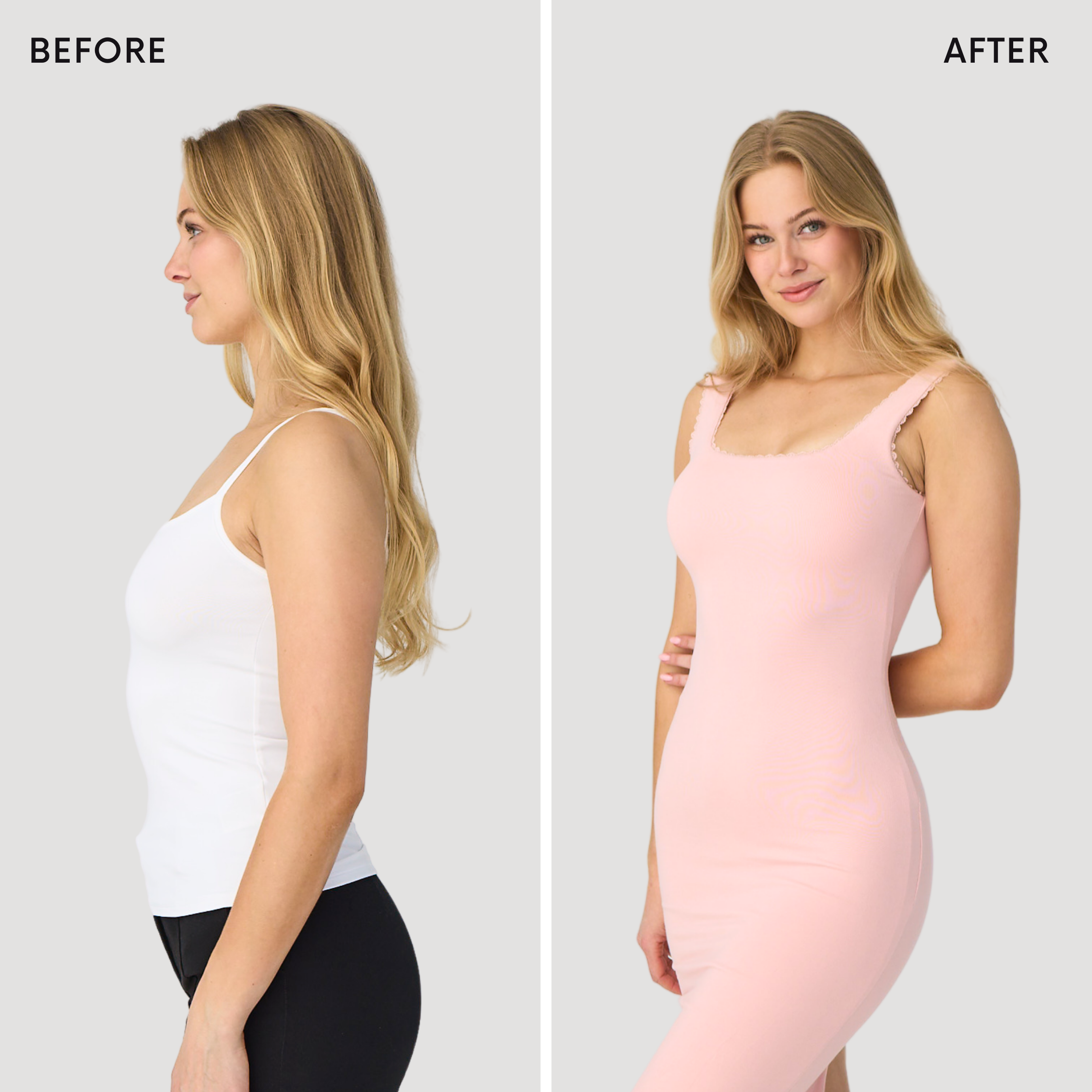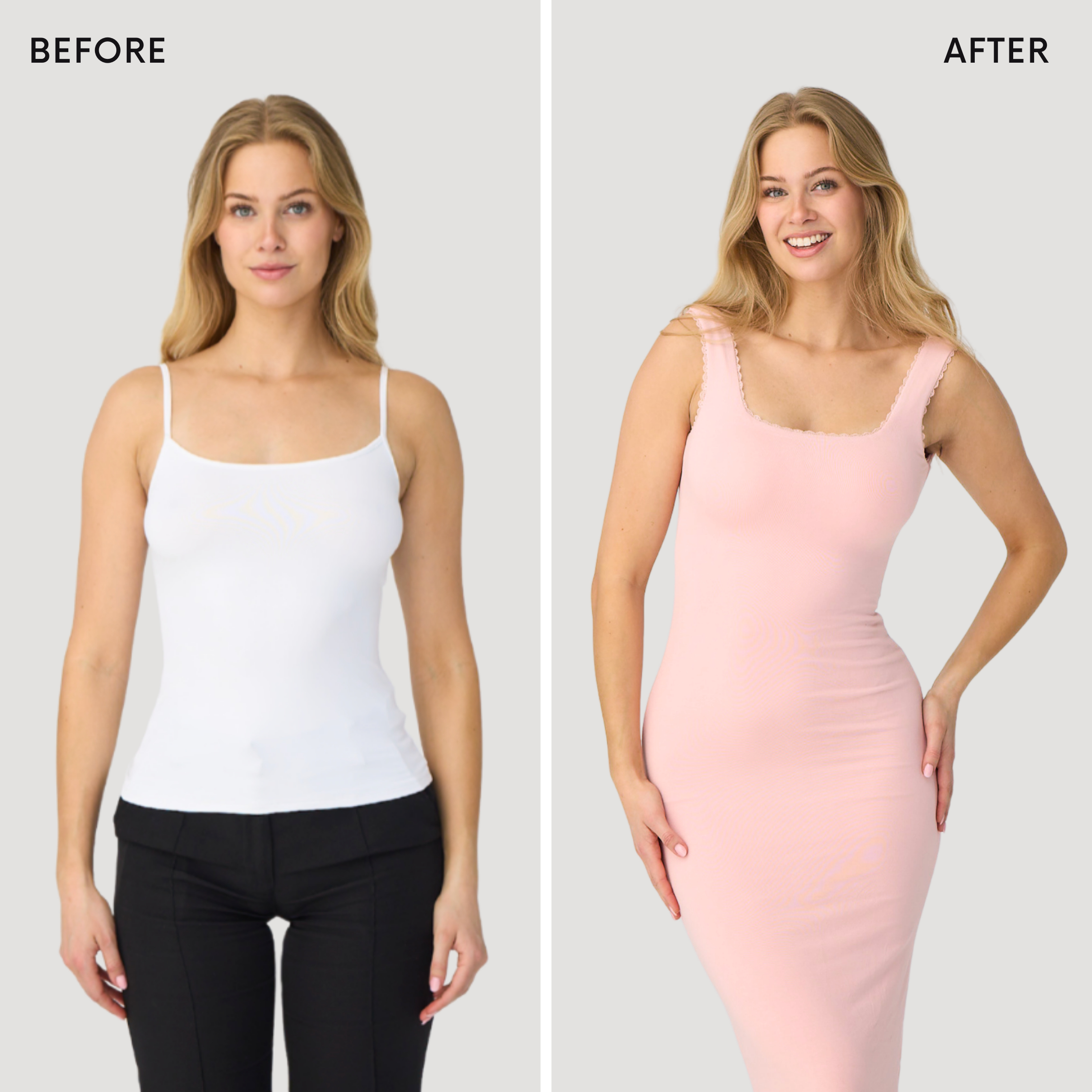 Introducing the lace midi dress. With built-in support, full coverage, and a shaping slip dress! A snatching and sculpting mid-length dress designed with ultra-soft elastic material for ultimate comfort, without the need for a bra! Featuring the most beautiful deep V-neckline at the back.